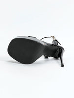 Tout est dans l'épure. Une bride fine qui enserre la cheville, une bandelette vernie qui retient l'avant du pied, et sous tout ça une plateforme noire laquée qui propulse la silhouette vers le haut avec une élégance déconcertante.